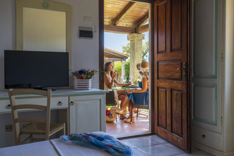 Camere: inserite in villette a schiera sono tutte a piano terra e circondate da un grande giardino. Hanno ingresso indipendente e sono elegantemente arredate con i colori del sole e del mare, tipici dell’architettura locale. Dispongono di servizi privati con doccia (senza bidet), asciugacapelli, TV SAT con canali stranieri, telefono diretto, cassetta di sicurezza, minibar (consumazioni a pagamento), aria condizionata, patio o veranda coperta attrezzata con tavolo e sedie. Si suddividono in: